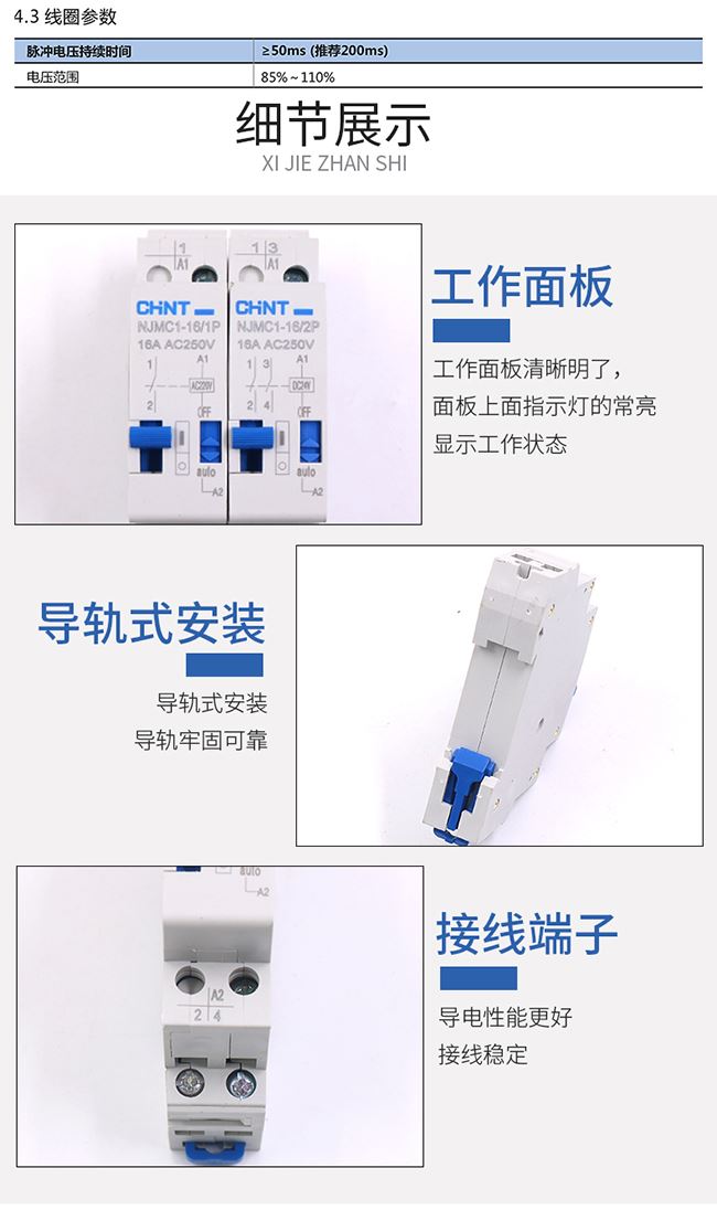 Contact switching current of up to 16A and 32A; a complete range of AC/DC specifications; NJMC1 pulse relay is a mechanical bistable relay that changes the contact state by inputting pulse signals.